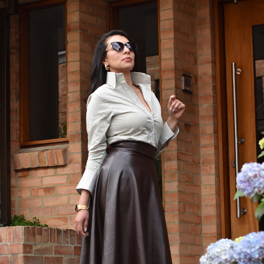 💚 ¡NUEVA! Camisa Rayas Verde Cuello Alto.